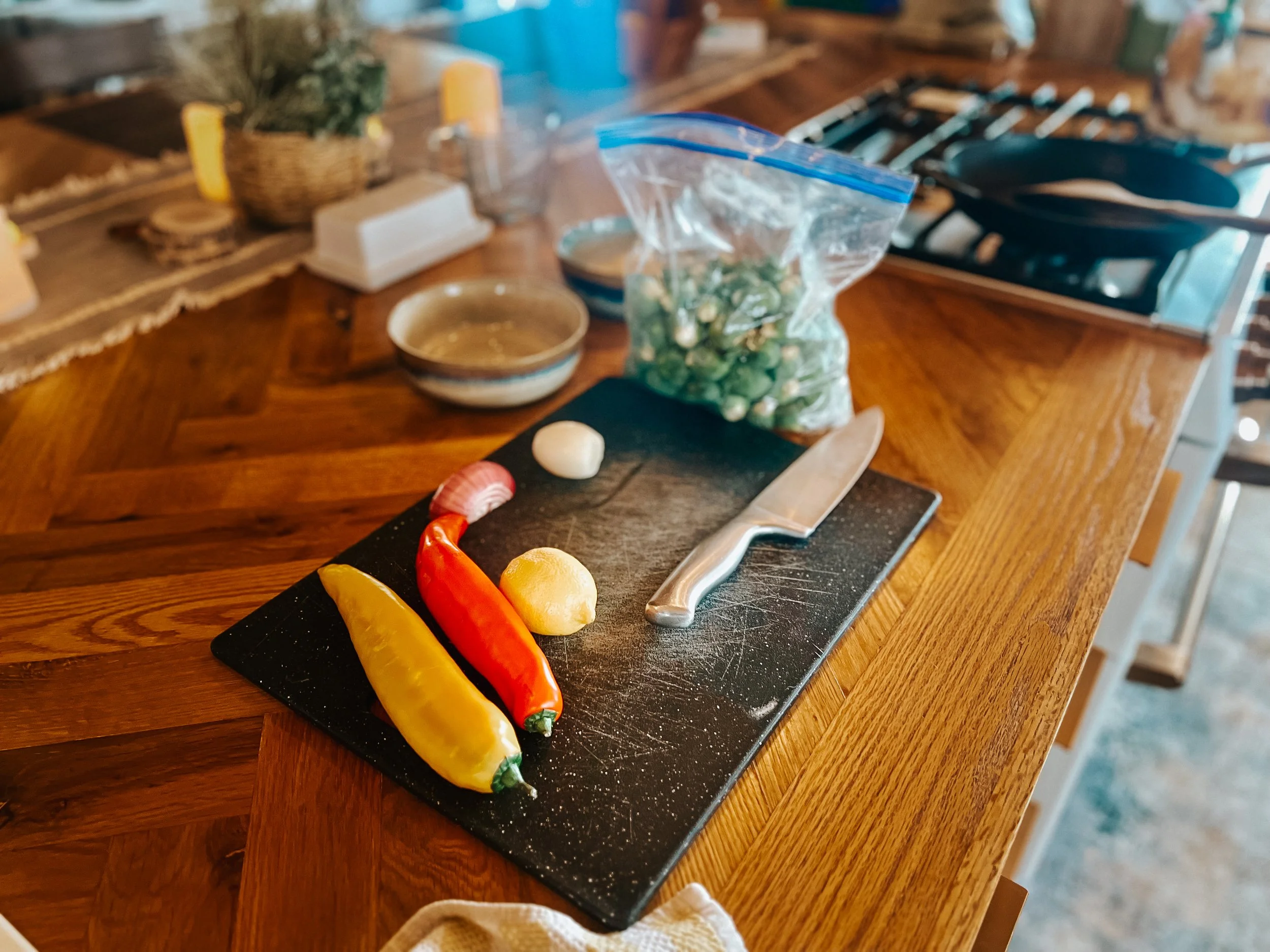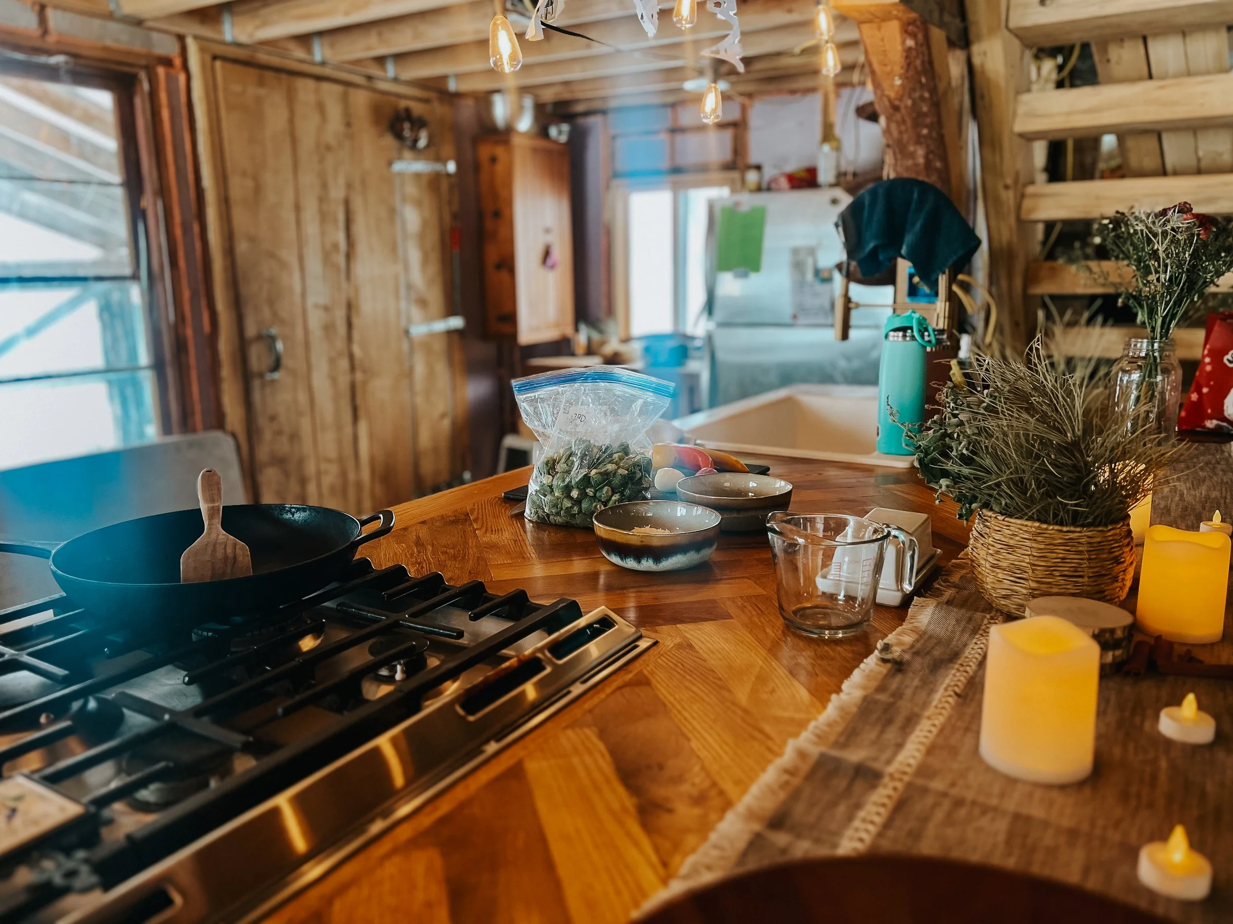 Walking into Nichole’s home, I was met by excitable mutts, a waft of delectable farm-raised bacon, and an expansive view of their newly renovated home. With thick, reclaimed beams for the stairs and tall windows throughout, it’s hard to believe that the home was the original farmhouse. As we chat, Nichole chops and seasons, sautees and broils across the kitchen island. Faux candles flicker, houseplants reach toward the sun, and dogs adjust lazily to the space of themselves on couches in the living room. If ever there was a scene of hygge, this would be it.