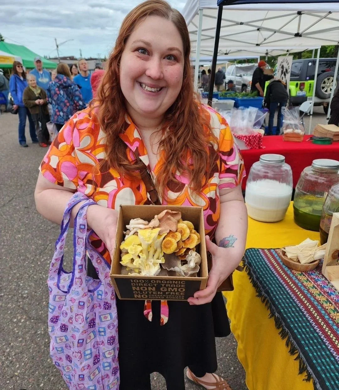When we first moved here, my first market I went to Zach's table for mushrooms and he offered to build me this variety box with a little of each type of mushroom he had. It was this beautiful fungus bouquet that I spent the rest of the market walking around with. Nearly every person I passed stopped me to say something about it. It was such a connection organically; we all shared this joy for the experience of being at the markets, talking to each other about the things we love. That's really what kicked off my social media interest in posting market goods.